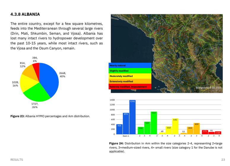 Sipas studimit, përqindja e lumenjve pothuajse natyrorë në Shqipëri ka rënë nga 68% në vitin 2012 në vetëm 40% në vitin 2025. Kjo si pasojë e ndërtimit të hidrocentraleve, ndërhyrjeve në shtretërit e lumenjve dhe nxjerrjes së pakontrolluar të zhavorrit.