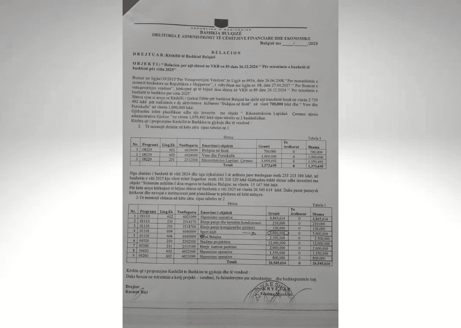 Në relacionin thuhet se nga zbatimi i buxhetit të vitit 2024 dhe tejkalimi i të ardhurave është trashëguar një shumë prej rreth 235,213,300 lekësh, ndërsa në buxhetin e vitit 2025 kjo shumë është llogaritur të jetë rreth 193,520,120 lekë. Gjithashtu është shtuar edhe investimi me objekt “Sistemim dhe asfaltim i disa rrugëve në Bashkinë Bulqizë” në vlerën 15,147,566 lekë. Për këto arsye, kërkohet një shtesë në buxhetin e vitit 2025 në shumën 26,545,614 lekë ose afro 272 mijë euro, me qëllim financimin e projekteve dhe shpenzimeve të mëposhtme: