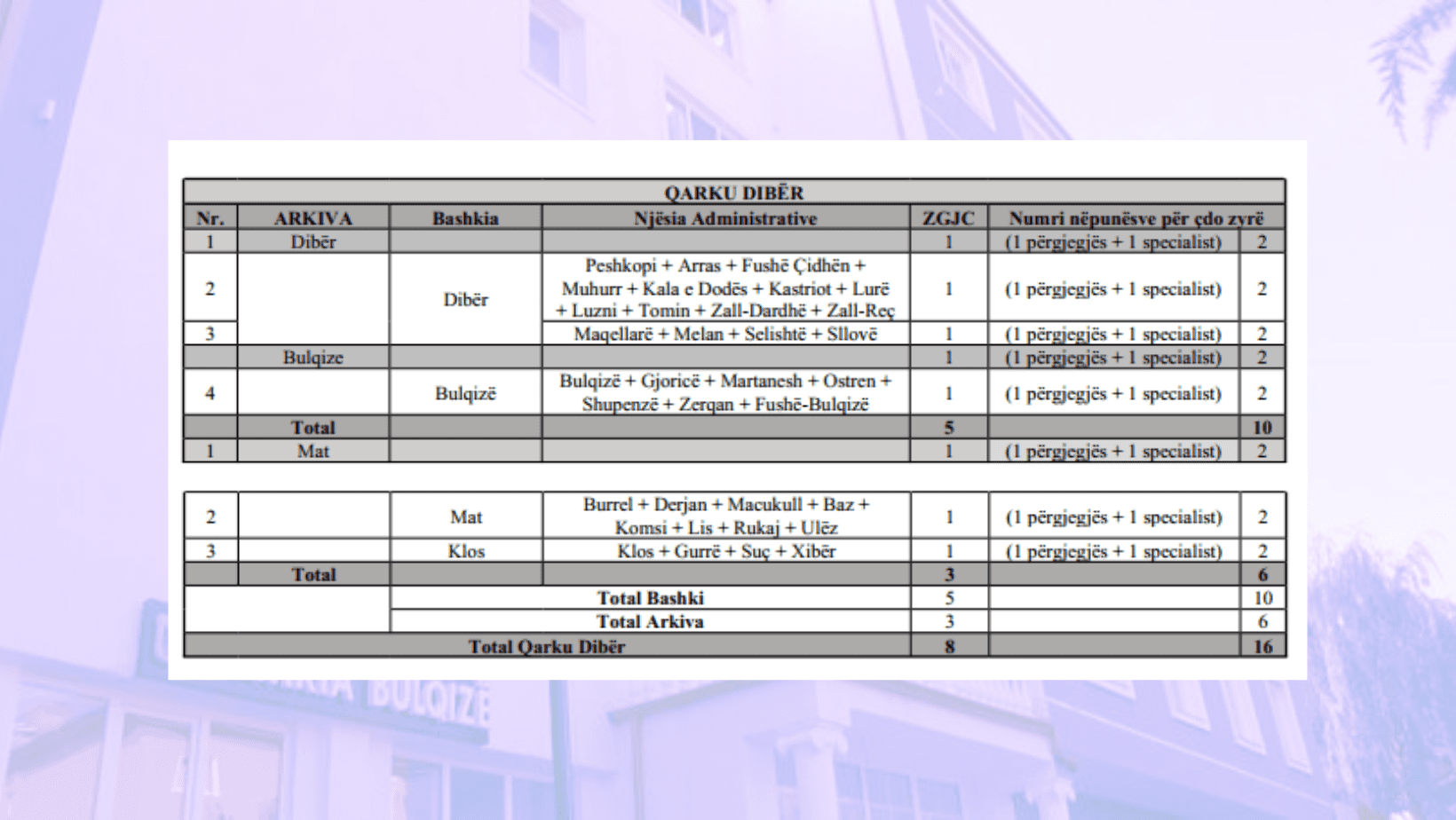 Sipas pasqyrës shoqëruese të vendimit, për Qarkun Dibër parashikohen gjithsej 8 zyra të shërbimit të gjendjes civile dhe 16 punonjës, ku përfshihen edhe zyrat e arkivit pranë prefekturës. Vendimi përcakton gjithashtu se aktet dhe dokumentet e zyrave që mbyllen do të transferohen dhe do të ruhen sipas legjislacionit për arkivat, ndërsa marrëdhëniet e punës për punonjësit që preken nga ristrukturimi do të trajtohen në përputhje me Kodin e Punës.