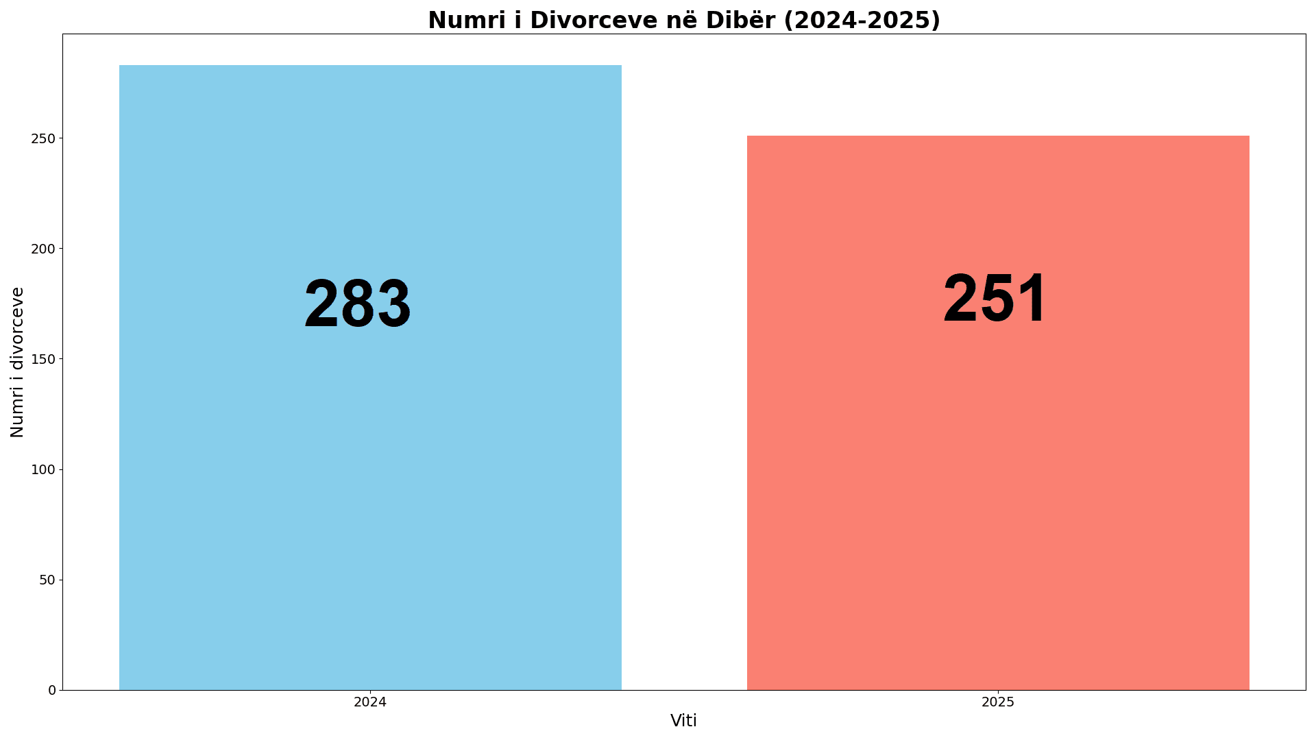 Gjatë vitit 2024, gjykata ka dhënë 283 vendime përfundimtare për divorc. Edhe pse shifra për vitin 2025 (deri më 23 dhjetor) është më e ulët, duhet të mbahet parasysh se disa procese gjyqësore përfundohen pas mbylljes së vitit kalendarik. Por këto të dhëna tregojnë se tendenca mbetet e lartë.