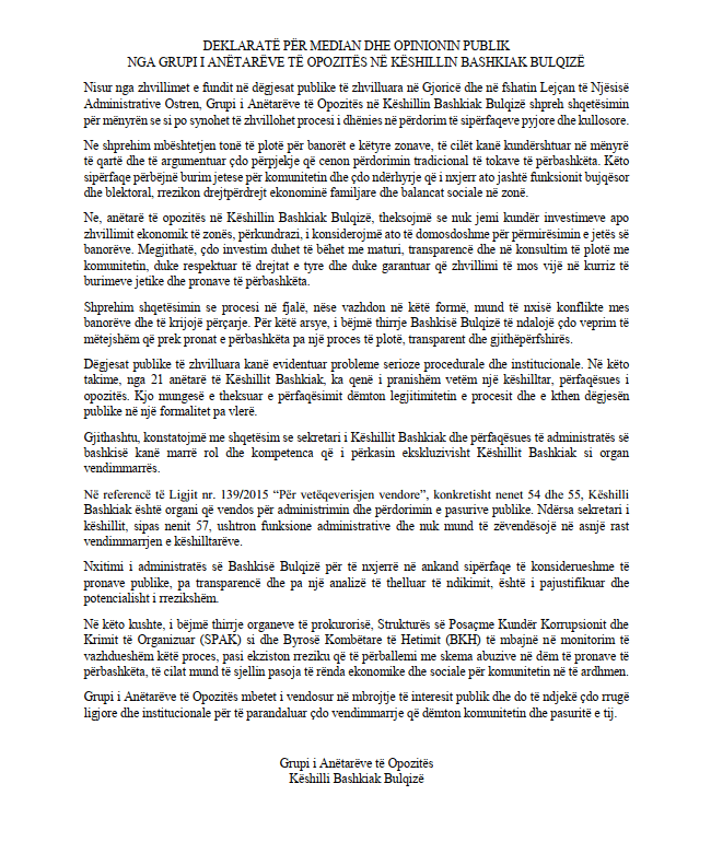 Ne, anëtarë të opozitës në Këshillin Bashkiak Bulqizë, theksojmë se nuk jemi kundër investimeve apo zhvillimit ekonomik të zonës, përkundrazi, i konsiderojmë ato të domosdoshme për përmirësimin e jetës së banorëve. Megjithatë, çdo investim duhet të bëhet me maturi, transparencë dhe në konsultim të plotë me komunitetin, duke respektuar të drejtat e tyre dhe duke garantuar që zhvillimi të mos vijë në kurriz të burimeve jetike dhe pronave të përbashkëta.