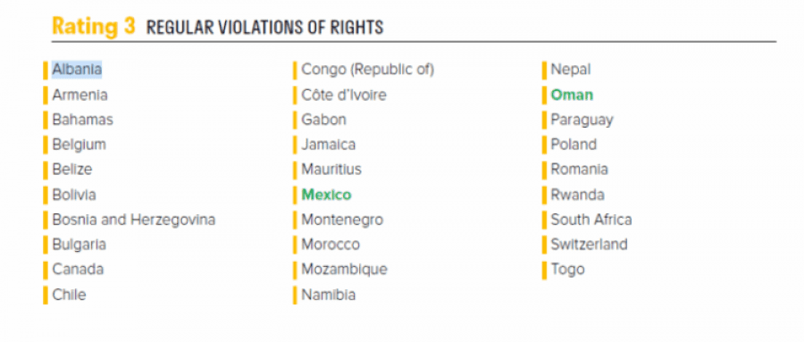Shqipëria renditet sërish në grupin e vendeve me shkelje sistematike të të drejtave të punëtorëve, sipas Indeksit Global të të Drejtave të Punës për vitin 2025, të publikuar nga Konfederata Ndërkombëtare e Sindikatave (ITUC). Vendi mbetet në kategorinë 3 nga 5, që nënkupton se ligji mund të njohë disa të drejta, por në praktikë punëtorët përballen me pengesa të rënda për t’i ushtruar ato.