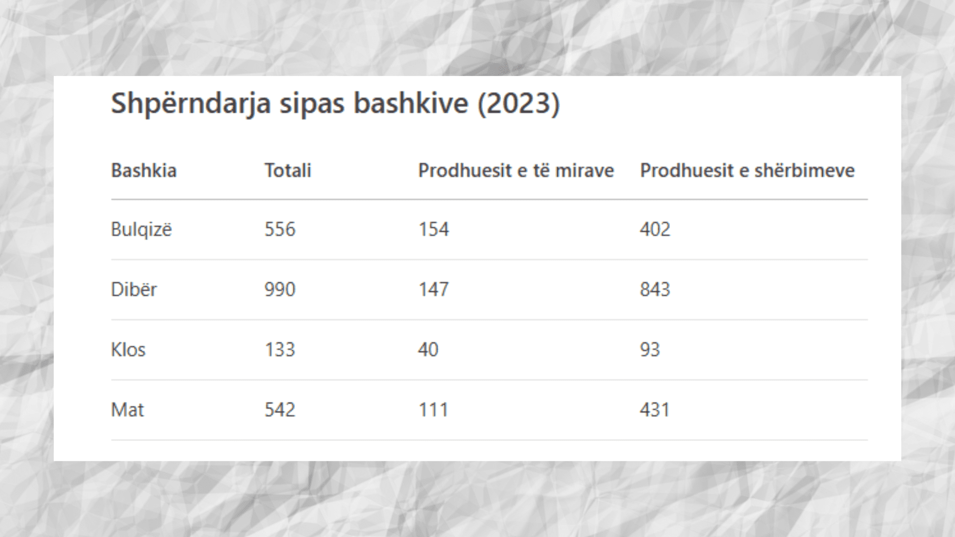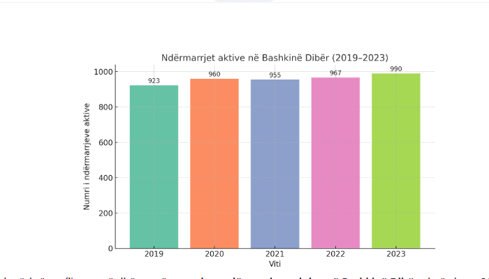 Në kontrast me Bulqizën, Bashkia Dibër ka regjistruar një rritje të qëndrueshme në numrin e ndërmarrjeve. Në vitin 2019 kishte 923 ndërmarrje, ndërsa në vitin 2023 ky numër u rrit në 990, duke përfshirë një rritje prej 7.3%. Të dy sektorët, si prodhimi i të mirave ashtu edhe shërbimet, treguan rritje, me përkatësisht 9 dhe 58 ndërmarrje të reja. Kjo tregon një ekonomi më dinamike dhe të shëndoshë në këtë bashki, me mundësi më të mira për zhvillim ekonomik dhe krijim të vendeve të reja të punës.