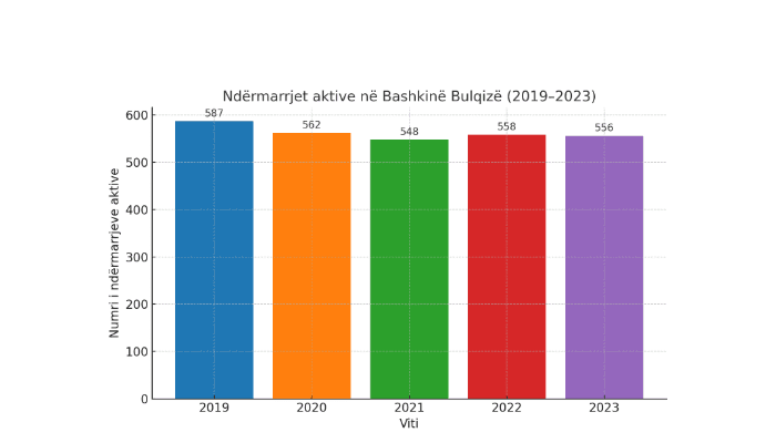 Në vitin 2019, bashkia Bulqizw kishte 587 ndërmarrje aktive, ndërsa në vitin 2023 ky numër u ul në 556, duke përfshirë një rënie prej 5.3%. Sektori i shërbimeve ishte më i prekshmi nga kjo rënie, me një ulje prej 31 ndërmarrjesh, ndërsa prodhimi i të mirave mbeti relativisht stabil me 154 ndërmarrje në të dy vitet e krahasuara. Kjo tregon një dobësim të sektorit të tregtisë dhe shërbimeve në rajon, ndërsa aktivitetet prodhuese kanë arritur të ruajnë pozicionin e tyre.