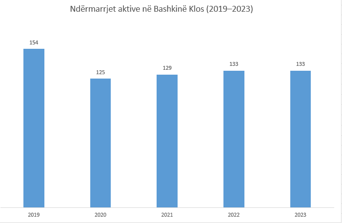 Klosi ka pasur një zhvillim më të kufizuar. Numri i përgjithshëm i ndërmarrjeve u ul nga 154 në vitin 2019 në 133 në vitin 2023, duke përfshirë një rënie prej 13.6%. Sektori i shërbimeve pësoi rënien më të madhe me 24 ndërmarrje më pak, ndërsa prodhimi i të mirave tregoi një rritje të lehtë prej 3 ndërmarrjesh. Ky është një tregues i problemit që përballet ky rajon me ruajtjen e bizneseve të vogla dhe shërbimeve, ndërkohë që ka një potencial të caktuar për rritje në sektorin prodhues.