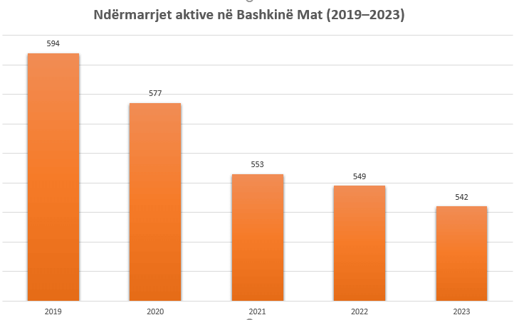 Mati ka pasur një rënie të konsiderueshme në numrin e ndërmarrjeve, duke zbritur nga 594 në vitin 2019 në 542 në vitin 2023, një rënie prej 8.8%. Sektori i shërbimeve ishte përsëri më i prekshmi me një ulje prej 47 ndërmarrjesh, ndërsa prodhimi i të mirave u ul me 5 ndërmarrje. Kjo tregon një tendencë negative të përgjithshme në ekonominë lokale, me nevojë për intervenime për të stimuluar bizneset dhe të rivitalizuar sektorin e shërbimeve.
