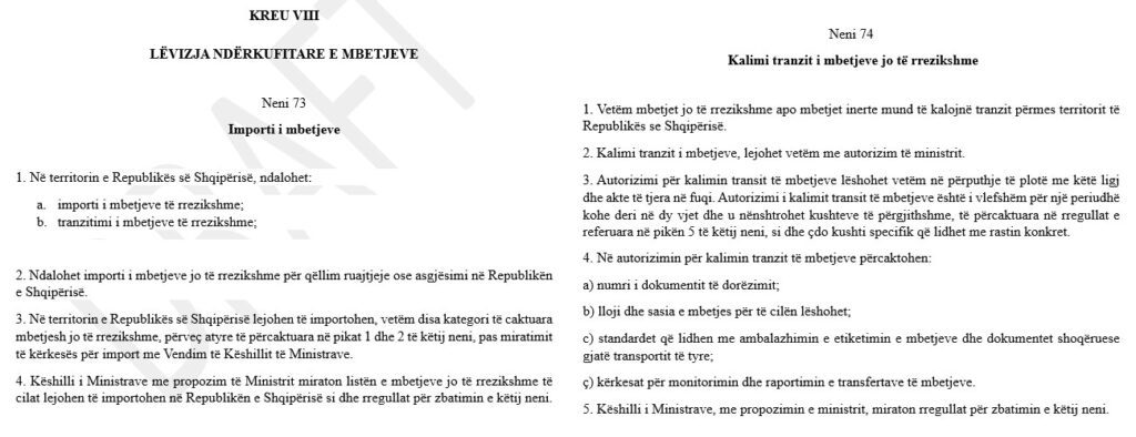 Projektligji ka për qëllim të zëvendësojë ligjin aktual për Menaxhimin e Integruar të Mbetjeve dhe në nenin 73 përcakton se, në përgjithësi, importi i mbetjeve në Shqipëri do të ndalohet, përveç rasteve kur Këshilli i Ministrave e miraton.