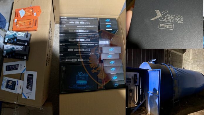 Gjithashtu gjatë kontrollit të ambienteve të subjektit janë sekuestruar 10 Aparate transmetimi sinjali televiziv (Android Tv), 13 Router interneti, kuti medikamentesh, artikuj të ndryshme kancelarie, pa dokumentacionin shoqërues, si dhe automjeti në të cilin ishin të instaluar dy serbatorë të mbushura me naftë gjithsej 145 litra.