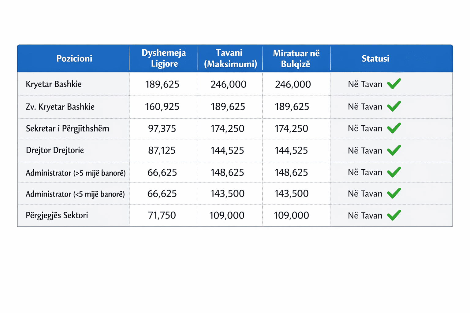 Krahasuar me vitin e kaluar, drejtuesit e Bashkisë Bulqizë do të përfitojnë rritje mesatarisht nga rreth 3,000 deri në 5,000 lekë të reja në muaj, në varësi të pozicionit që mbajnë në administratën vendore.