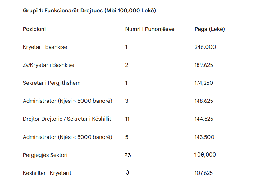 Paga e Kryetarit të Bashkisë është caktuar në 246 mijë lekë në muaj. Ndërsa dy zëvendëskryetarët e bashkisë do të paguhen me 189,625 lekë në muaj. Për pozicionin e Sekretarit të Përgjithshëm paga arrin në 174,250 lekë.